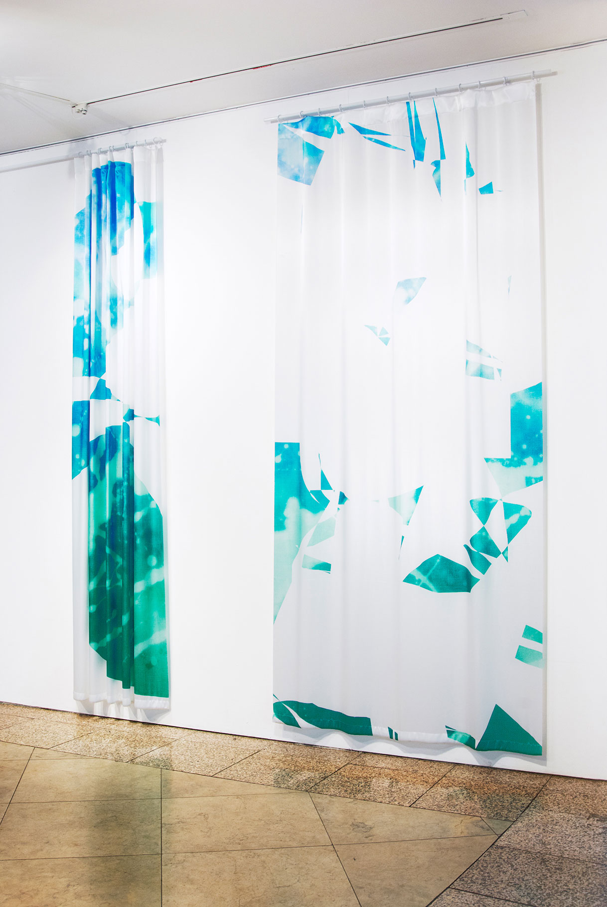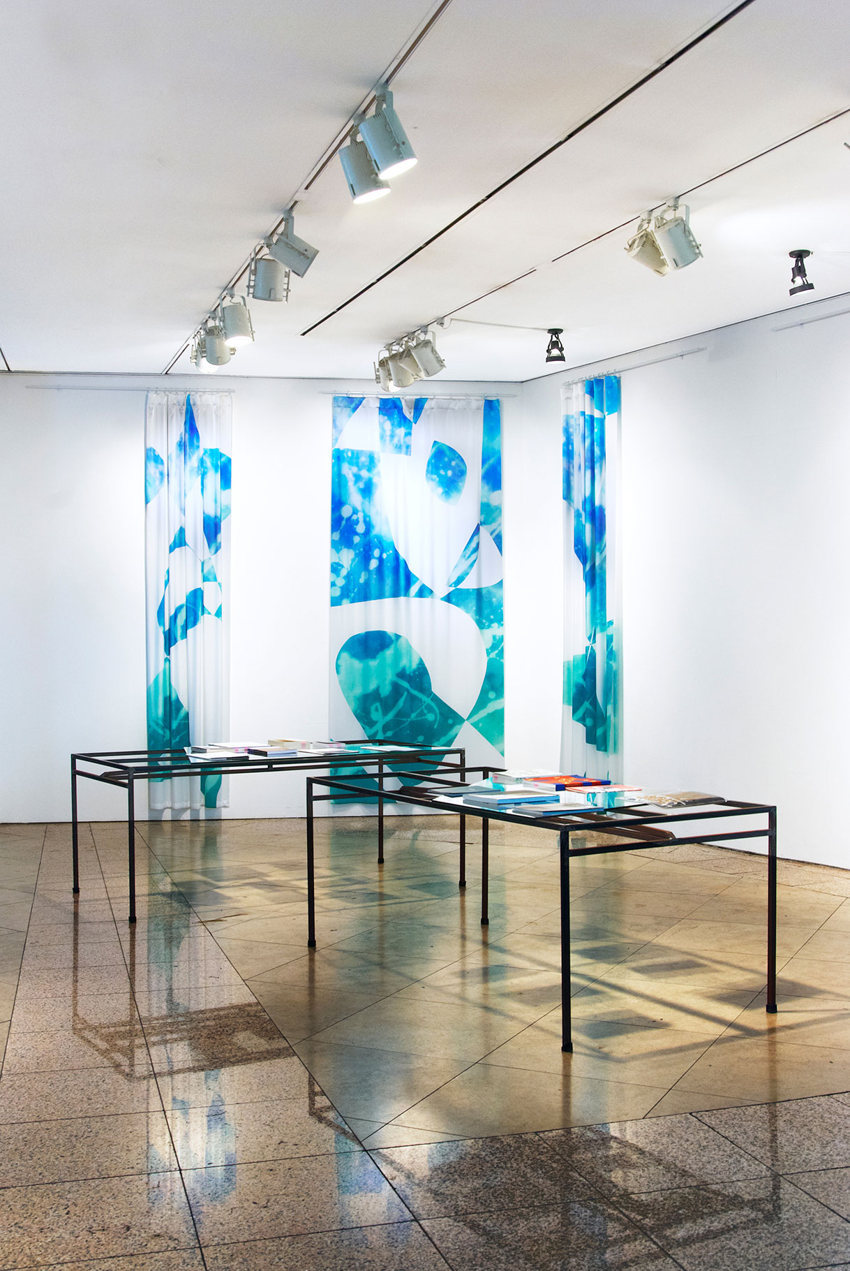 Digital print on satin curtain, 290 x 140 cm each, modified book table, glass, artist publication, dimensions variable