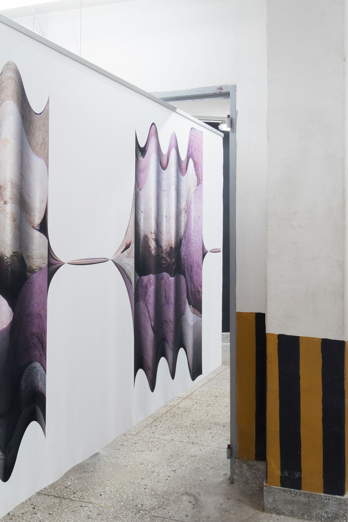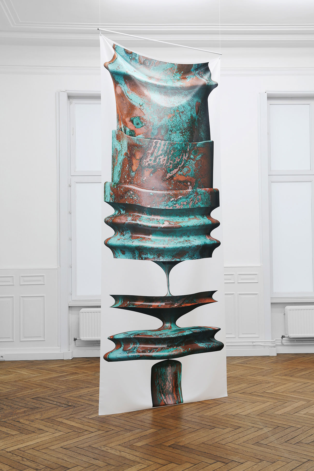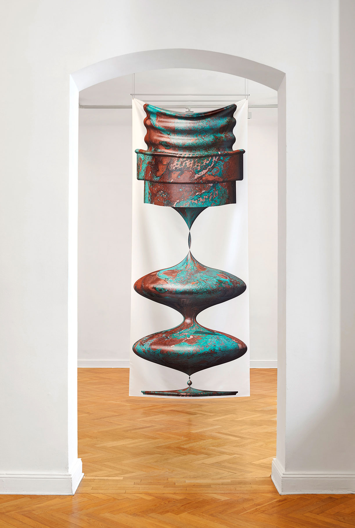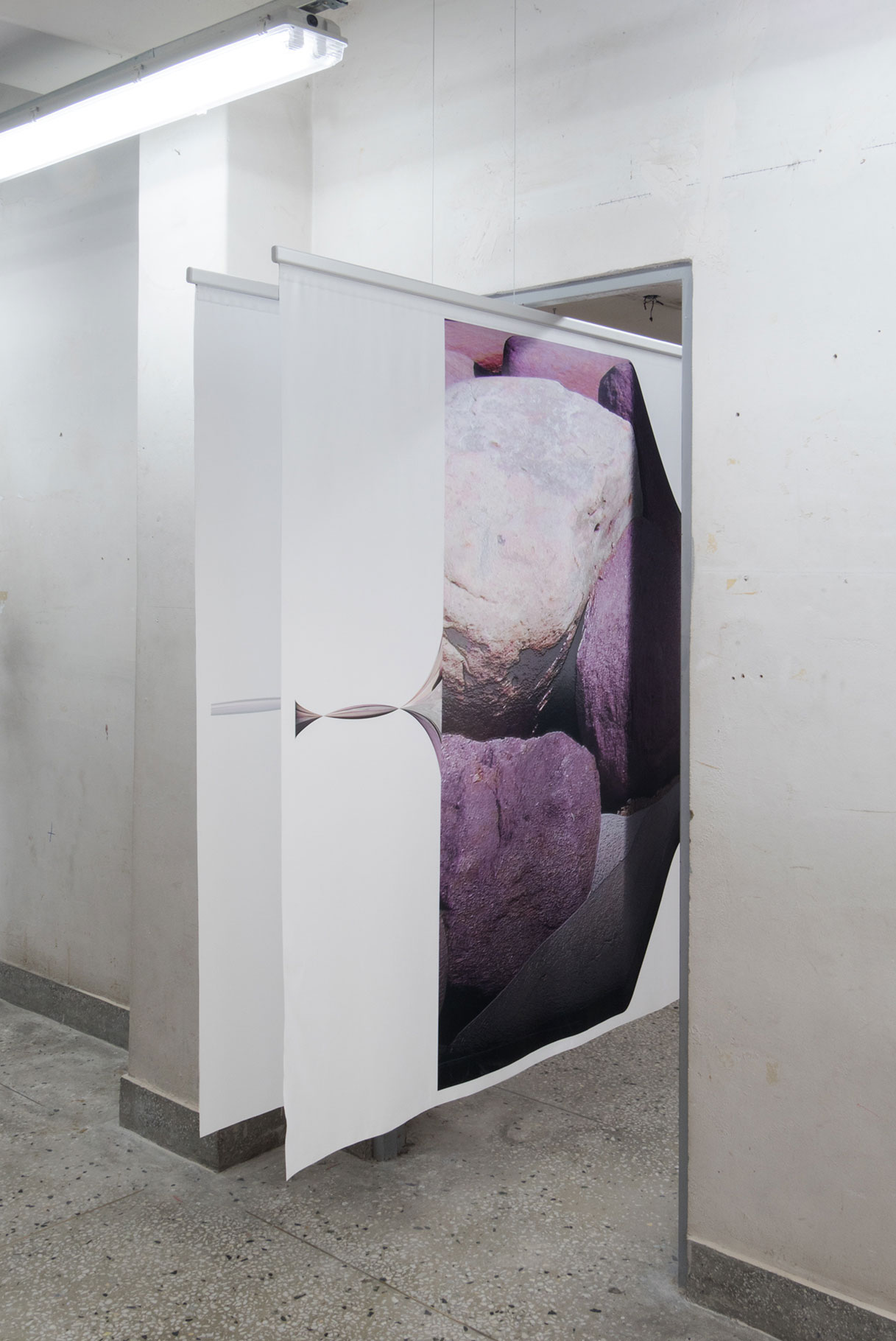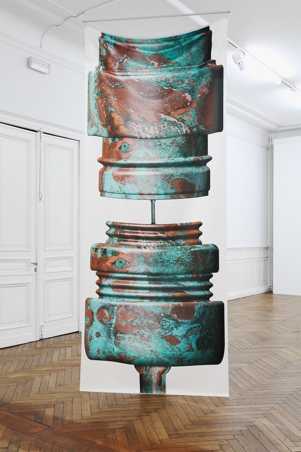 Posing Source #4, 2015, digital print on satin, aluminium bar, carabiner, steel wire, 360 x 140 x 10 cm